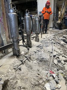 Breaking & splitting heavily reinforced concrete in the heart of the city under a multi story city block using a trio of hydraulic splitting cylinders.
