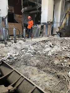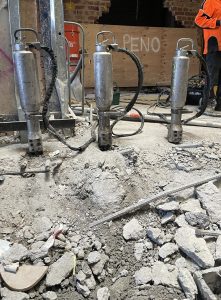 Breaking & splitting heavily reinforced concrete in the heart of the city under a multi story city block using a trio of hydraulic splitting cylinders.